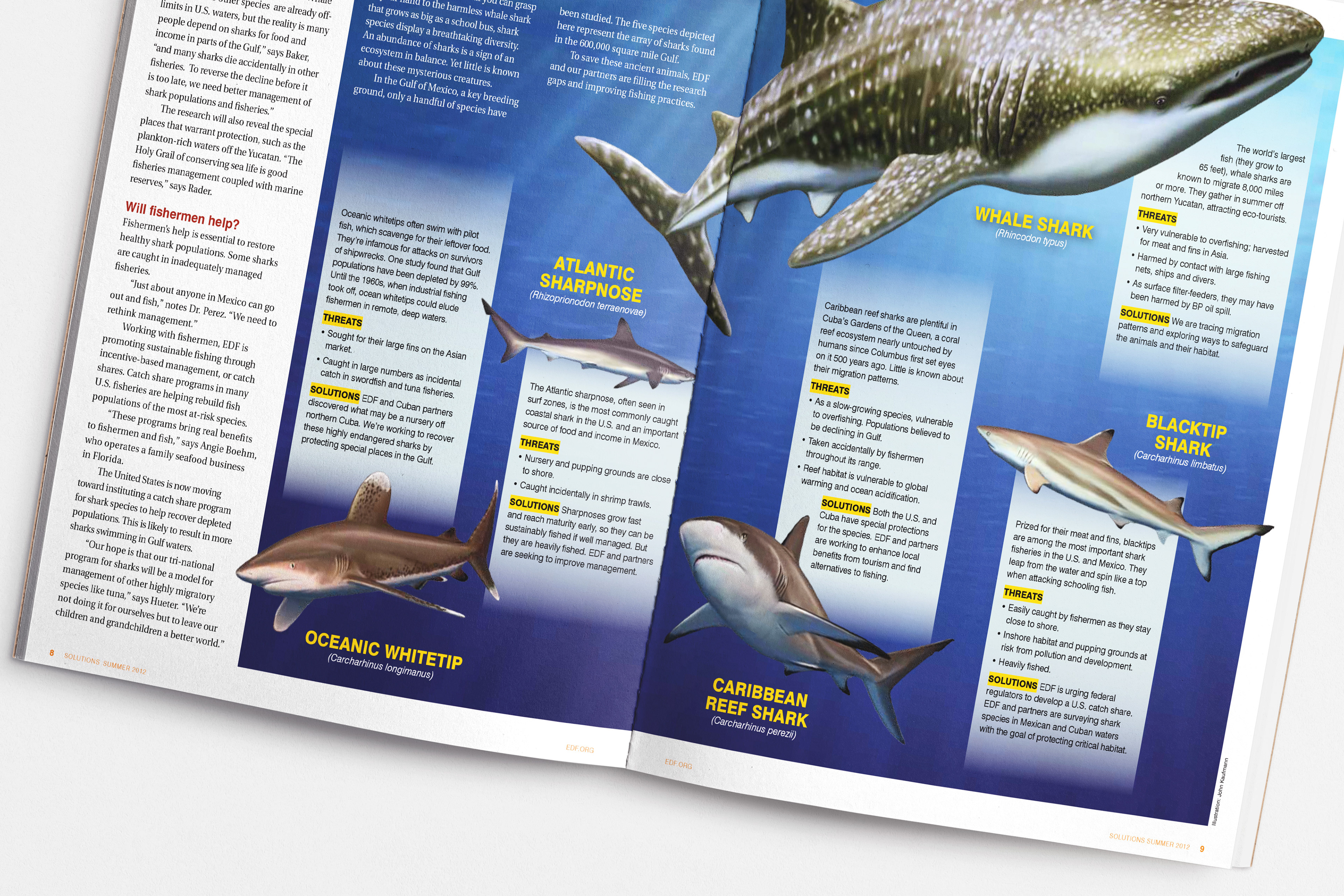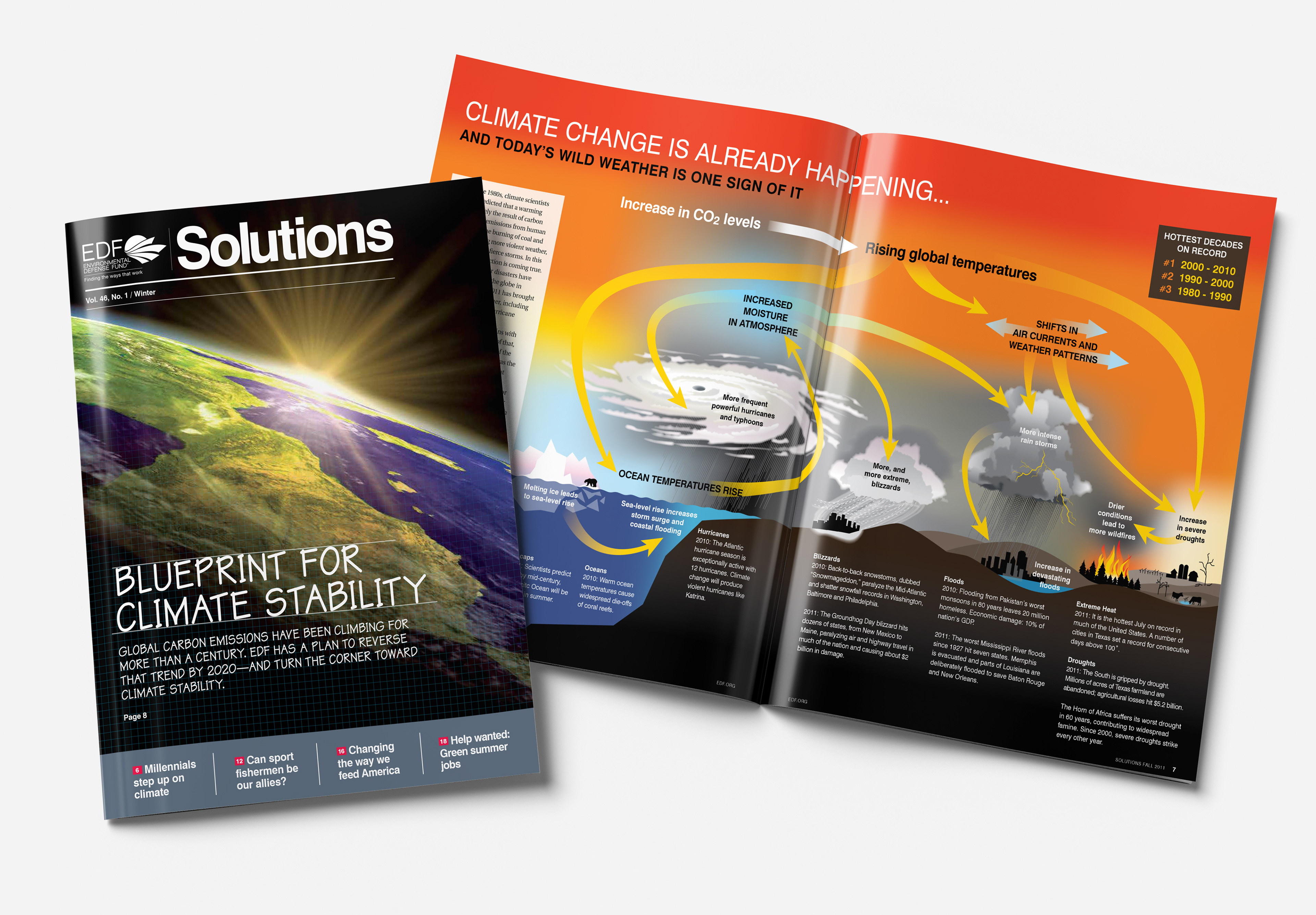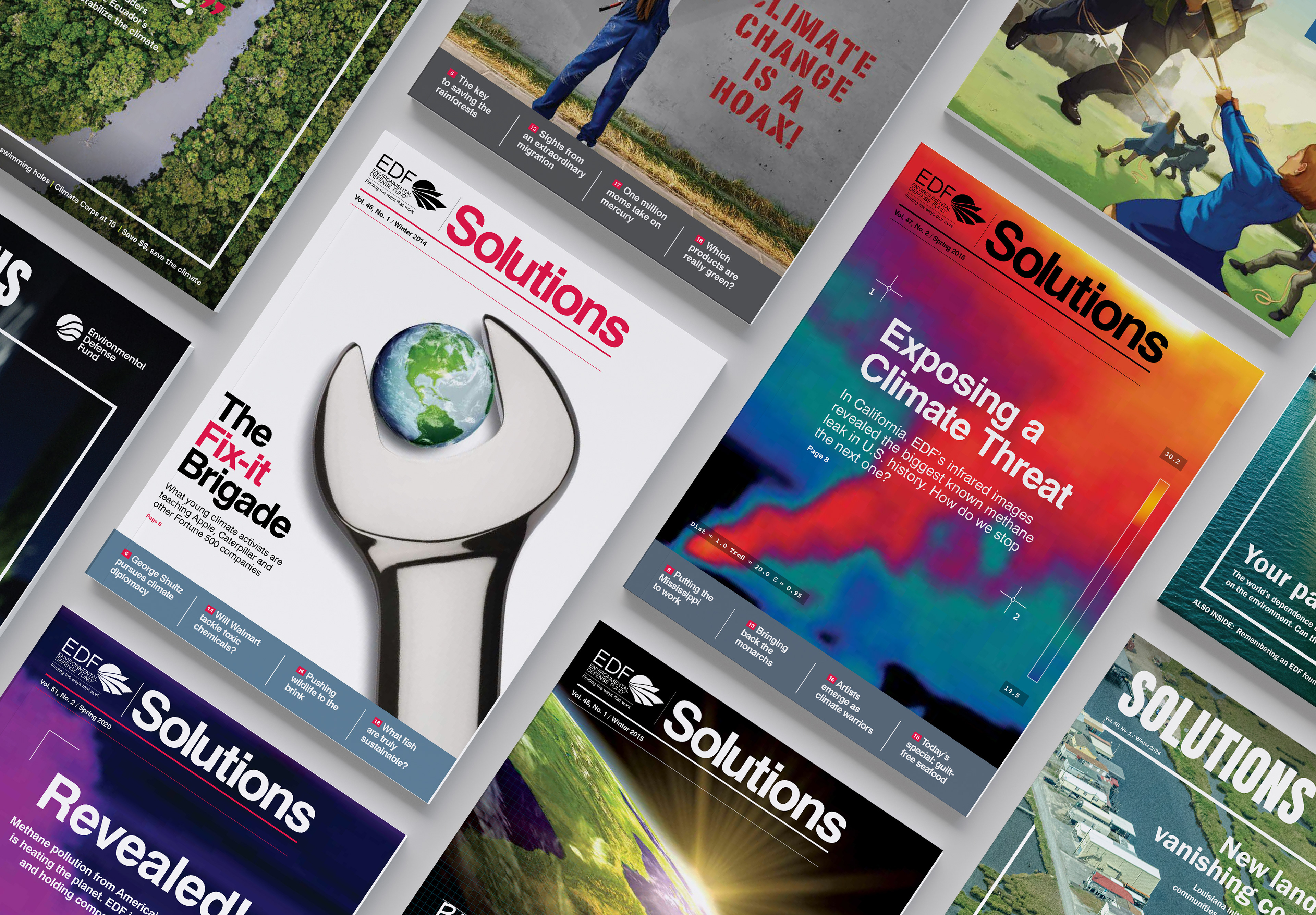 Led creative direction for EDF's flagship magazine "Solutions" across its full production cycle — from cover concepting and high-profile spreads to final design review, ensuring every issue met the highest standards of imagery, typography, layout, and print quality. Collaborated closely with the editor-in-chief, writers, designers, illustrators, photographers, and outside consultants. Over the course of three organizational rebrands, led the magazine's redesign each time to align with EDF's evolving brand identity. Distributed quarterly to 350,000 members.